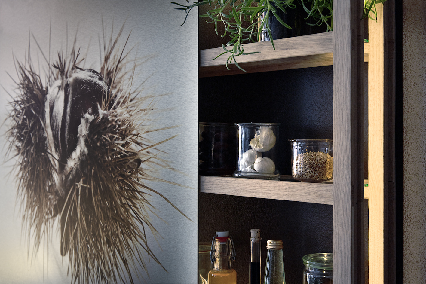LIVING med print. På mørk væg. EG Oliebehandlet / Røget . Funktion og dekoration i samspil.
